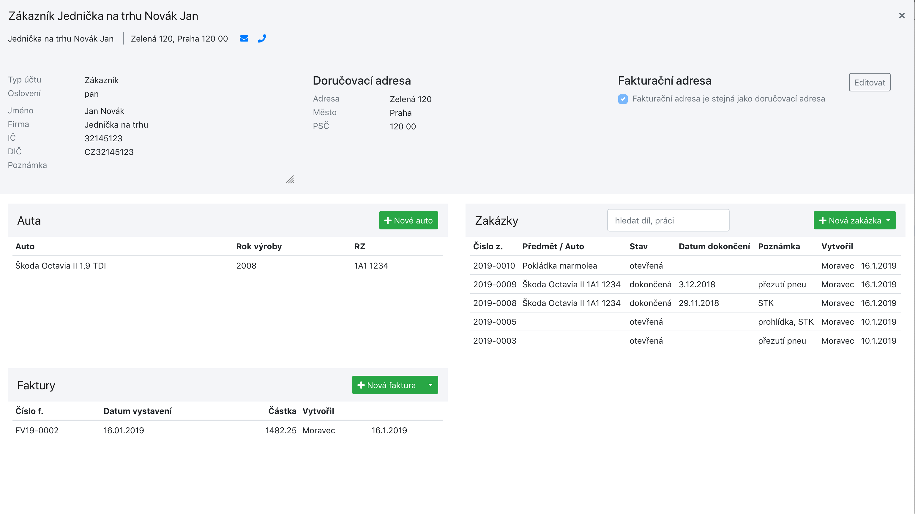 - Možnost vytvoření faktury, nebo zakázky přímo z karty zákazníka