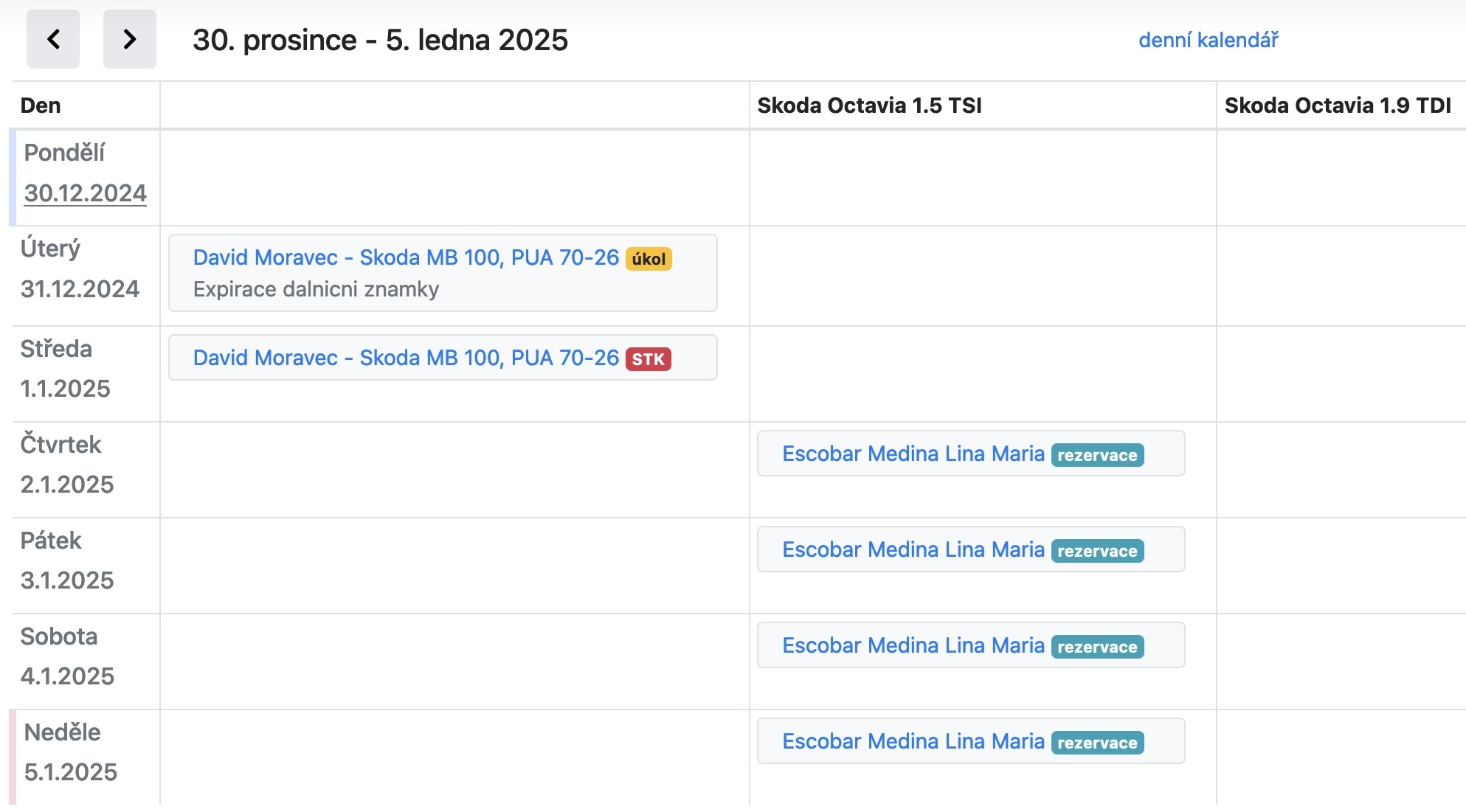 Kalendář umožňuje sledovat platnosti STK, dálničních známek, povinného ručení apod.